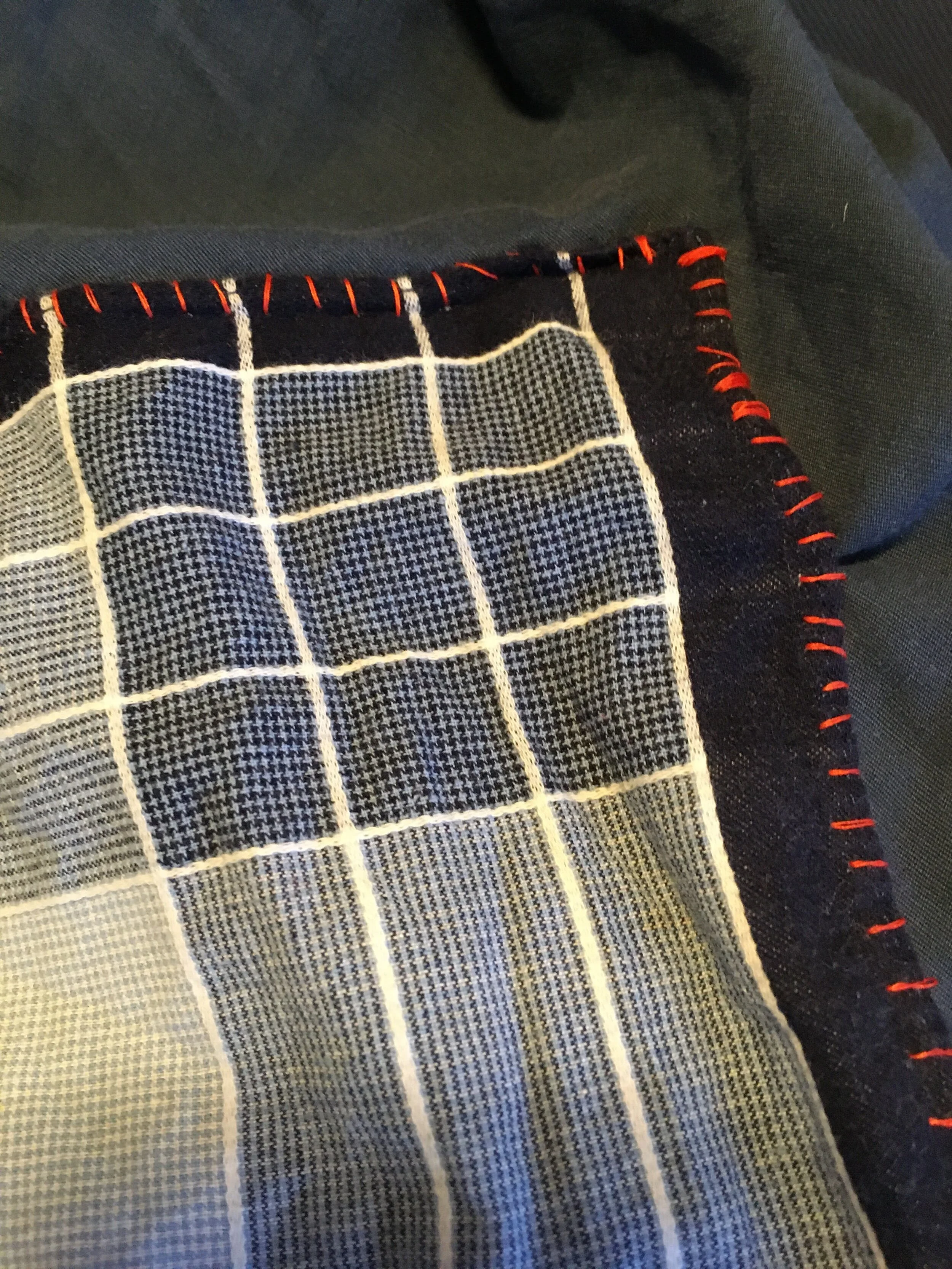 Anyway, I now had time to do a more thorough job. It pleased my eyes to see neat-ish bright orange stitches on my navy blue sheet—something I can only do when I concentrate fully. Funny to then see the evenness disappear as my thoughts would start to wander.